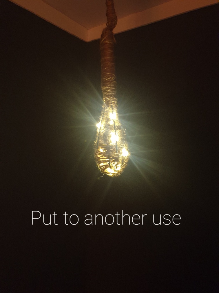 It can be hung up with lights inside to make a cosy atmosphere. the wires makes an interesting light play,or it can be added rope to make an other kind of lamp.